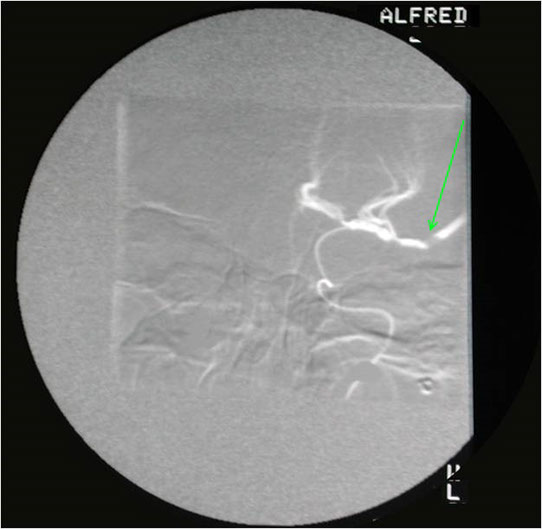 Selective catherization of feeding vessels revealed a small aneurysm which presumably is the cause of the haemorrhage, as indicated by the green arrow.