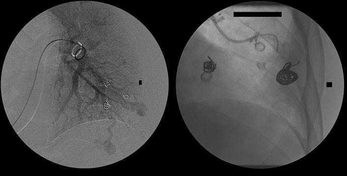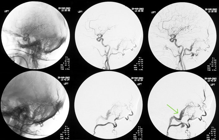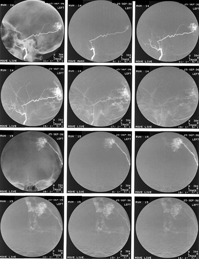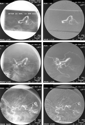 Images showing the location of multiple coils and marked reduction in the blood supply from the internal carotid artery. This procedure allowed the surgical removal of the AVM to be safer and much quicker, the lesion was removed in 4 hours.