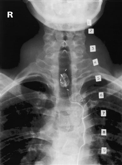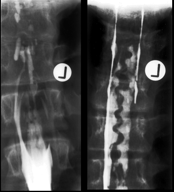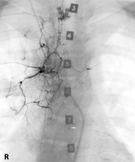 A spinal angiogram was carried out. The hairpin bend of the artery of Adamkiewicz was identified in the middle thoracic region and other vessels extending upwards showed a very vascular area at T2. It is important to identify the artery of Adamkiewicz as any fast obstruction of it may lead to infarction in the cord. In many elderly patients the artery is often not found at angiography, presumably due to slow obstruction due to atheroma which can be tolerated.