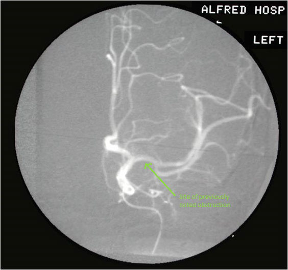 During the embolisation procedure it was noted that the patient did not converse with the radiologist and a cerebrovascular accident was suspected, here confirmed by a filling defect in the left middle cerebral artery.