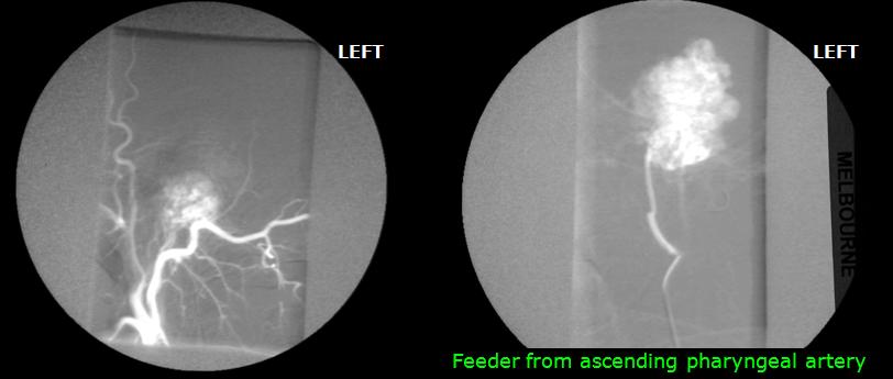 Angiography demonstrates a very vascular mass fed by the ascending pharyngeal artery as they often are.