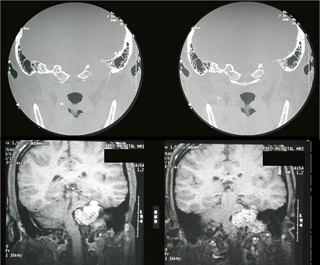 The CT scan shows the bone destructive lesion in the left petrous temporal bone in a patient with headache and ringing in the left ear.