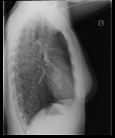 Lady with transient ischaemic attacks. Note the rounded density lateral to the right breast.