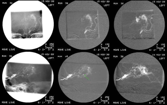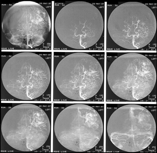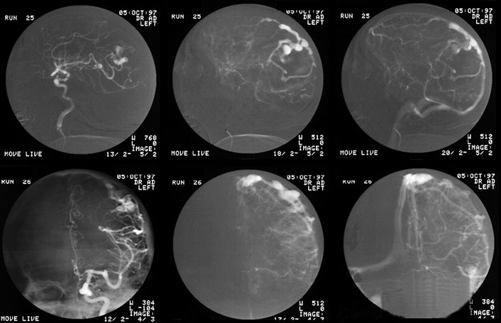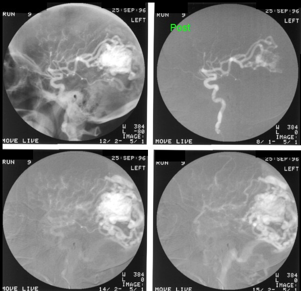This patient was known to have a vascular cerebral lesion. The patient saw a neurosurgeon operating on a similar patient on TV. She then decided to consult the same surgeon who successfully removed the arteriovenous malformation. Pre-operative embolisation of the arteriovenous malformation made the operation easier and the lesion was excised in 4 hours . Post embolisation images are seen in the top right image.