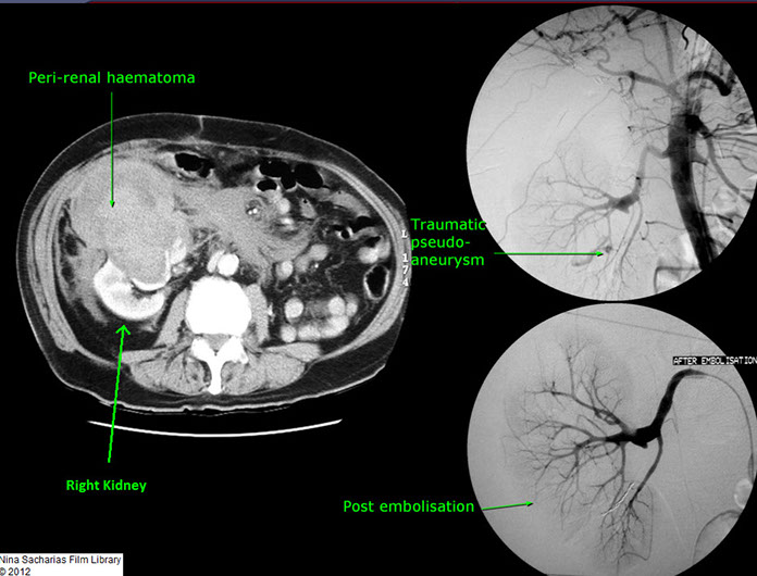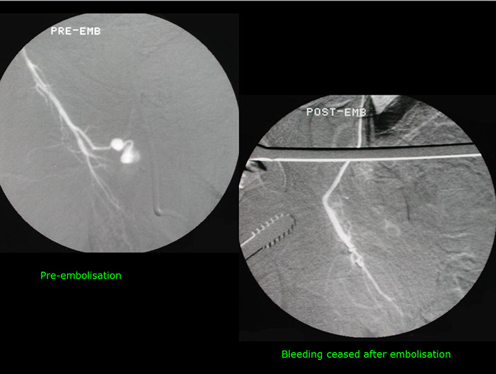 Bleeding from a pelvic vessel resulting from a fracture, controlled by embolisation