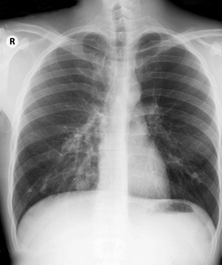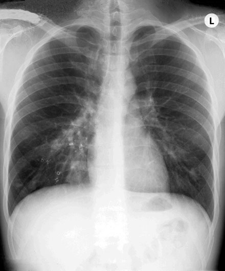 This 18 year boy had an abnormally high haemoglobin and tired easily. There were small blue venous spiders around his lips. Note the variety of rounded densities in both lungs.