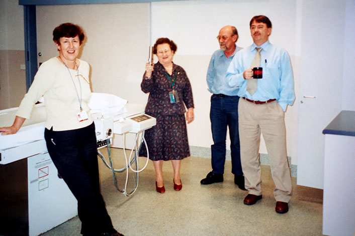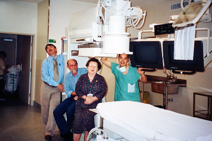 Dr Sacharias is here holding the control handle of the beloved old angiography unit being replaced by the new one. Dr Sacharias is here with Peter Hiscock, Neal Russell and Dianna Sullivan.