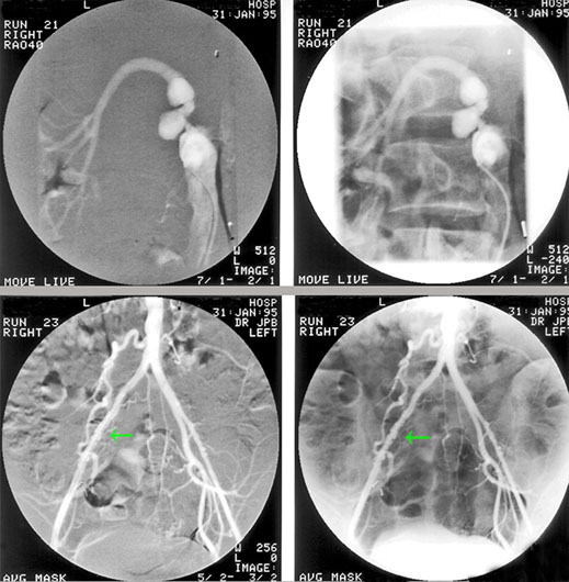 However, the graft again stenosed as you can see. Fibromuscular dysplasia may affect many arteries and here the arrow is pointing to disease of the right common iliac artery in the same patient.